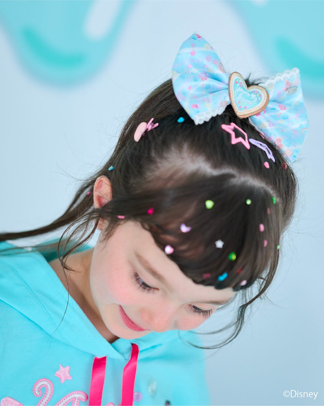 総柄のワンピースとお揃いのヘアクリップは、大きなリボンがとってもキュート!