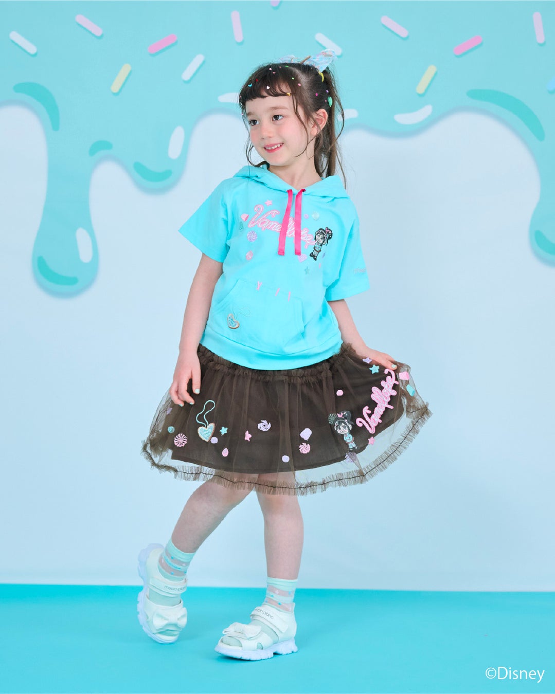 フーディーTシャツとチュールスカートは、お菓子の刺繍でキュートな世界観をたっぷり表現。
