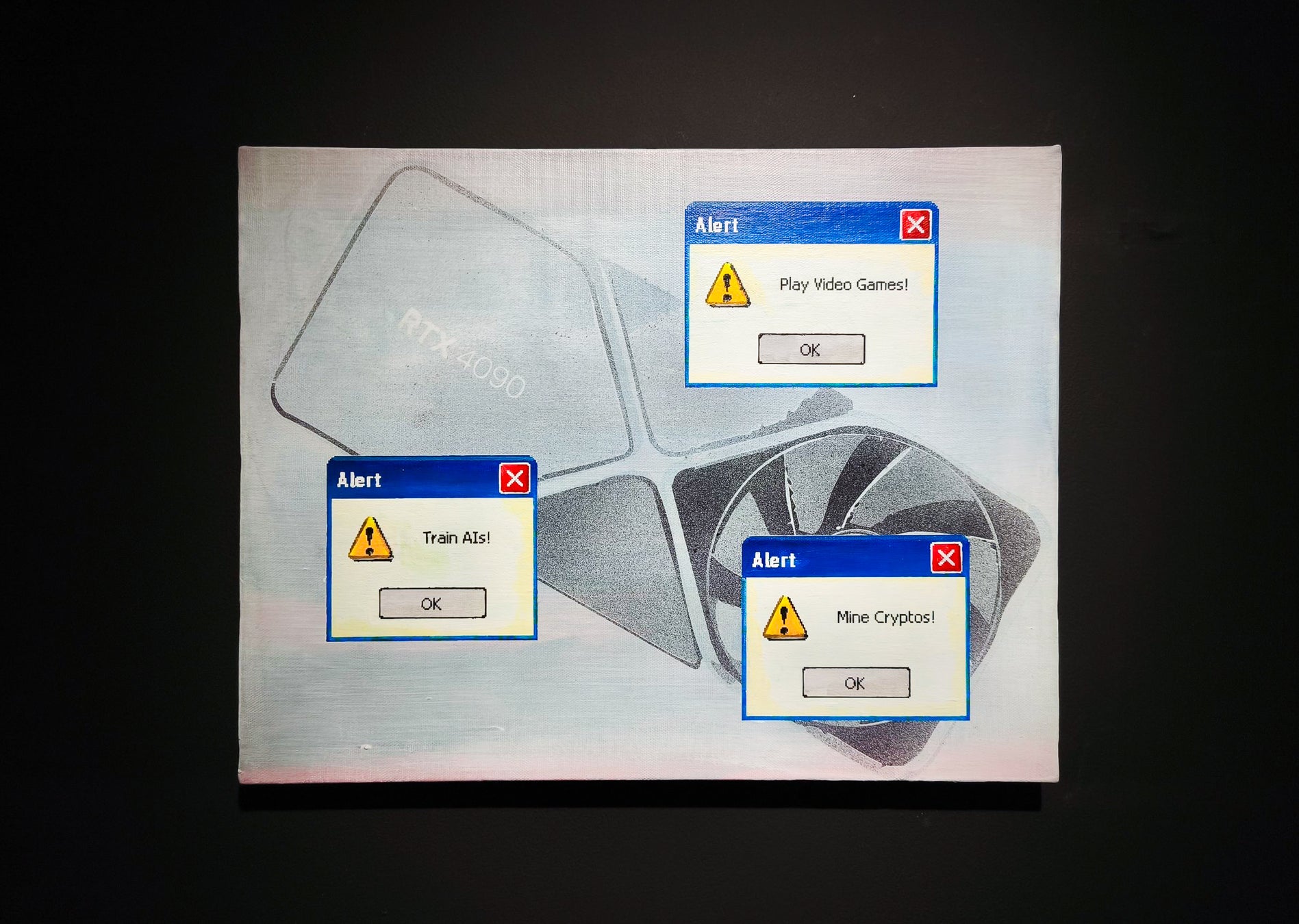 本展のキュレーターでもある半田颯哉は、ゲームを支えるハードウェア、とりわけGPUに着目します。AIや仮想通貨への応用による価格高騰を背景に、ゲームが仮想にとどまらず、現実の経済や資源と深く関わっていることを作品を通じて問いかけます。