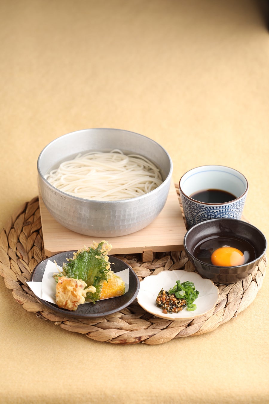 五島を代表する名産の、五島手延べうどんです。細身でこしが強く、滑らかで喉ごしの良さを持ち合わせます。あご出汁と薬味を添えて釜揚げ風にお召し上がりいただきます。川俣軍鶏、大葉、南瓜の天ぷらと一緒にお楽しみください。