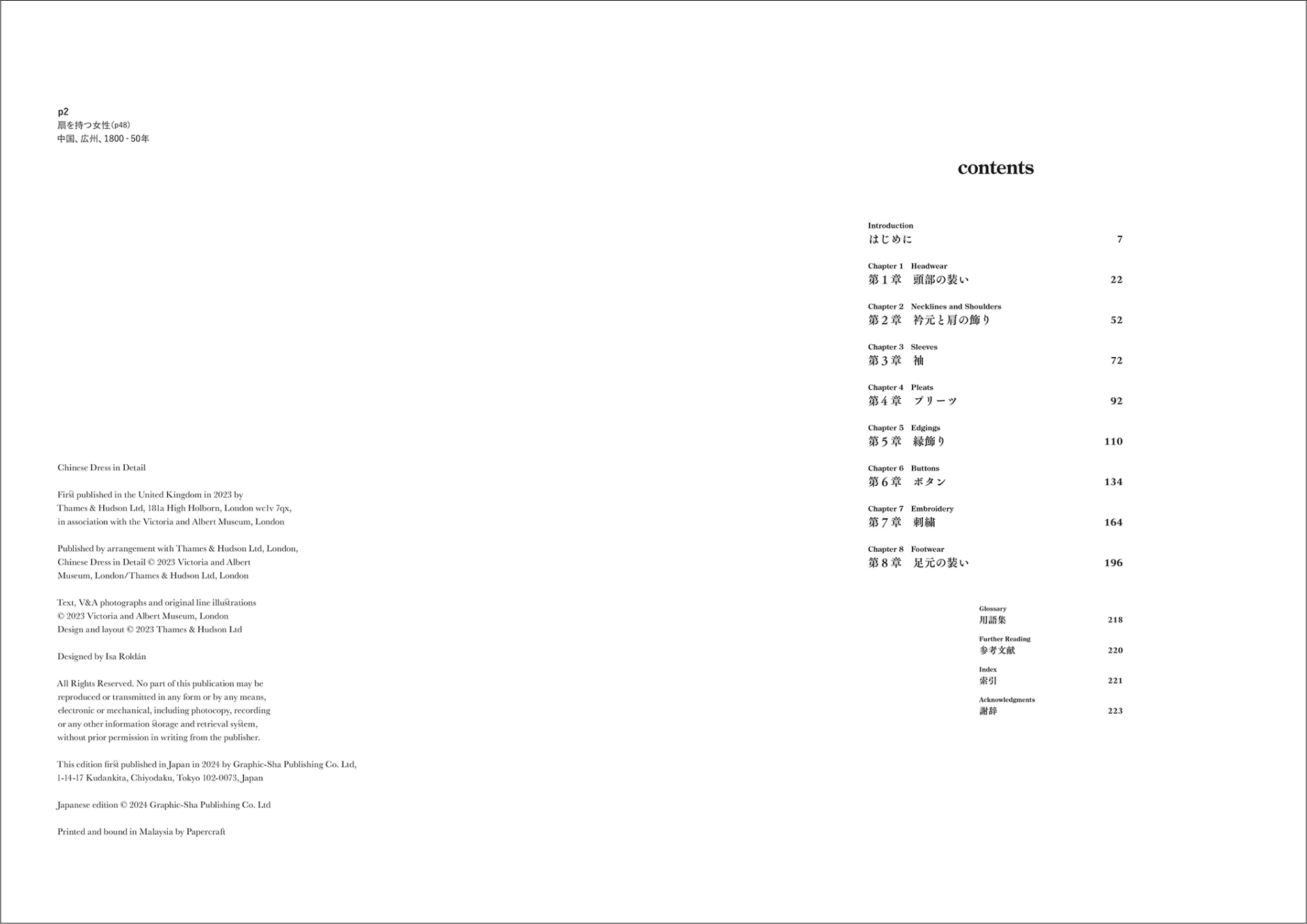 はじめに/第1章 頭部の装い/第2章 衿元と肩の飾り/第3章 袖/第4章 プリーツ/第5章 縁飾り/第6章 ボタン/第7章 刺繍/第8 章 足元の装い/用語集/参考文献/索引/謝辞