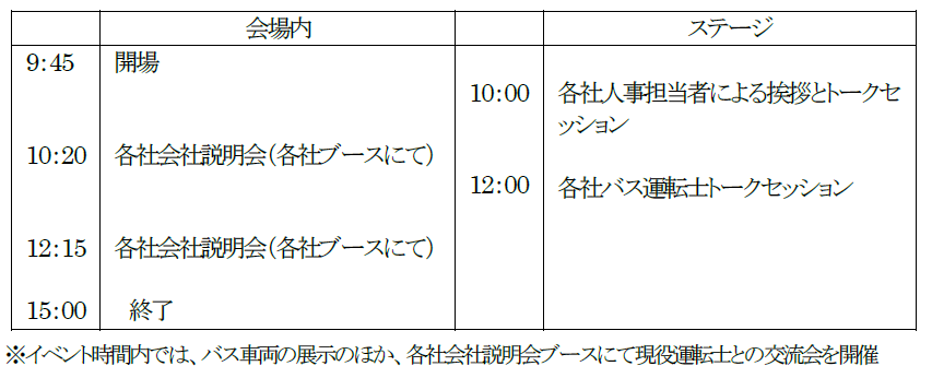 会場では、バス車両の前面に当日限定の「バスマスク」をあしらった各社バス車両の展示や車両撮影会のほか、会社説明会、現役運転士との交流会等を開催します。また、会社説明会の参加者先着100名様に、会場内キッチンカーで利用できる割引券(500円)を配布します。