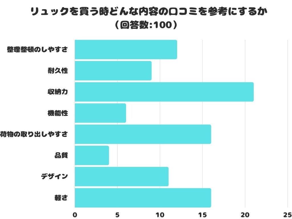 リュックのどんな内容の口コミを参考にするかをアンケートにて調査したところ、1位は「収納力」 でした。