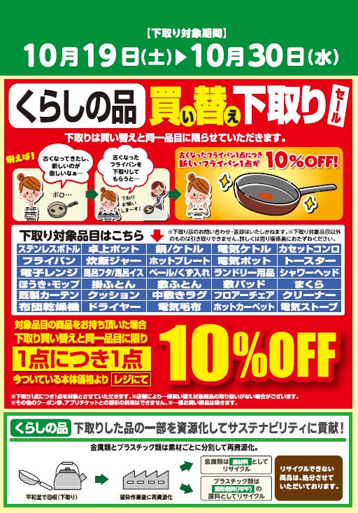 このセールは、ご不要になった衣料品・くつ・かばん・服飾やキッチン用品・家電・寝具などのくらしの品を店頭にお持ちいただくと、対象商品の購入金額から10%割引させていただくものです。これまで、衣料品・くつ・かばん・服飾ではご不要品と引き換えに割引券を配布しておりましたが、資源の削減のためにも割引券の配布はせず、対象商品の購入時に、お持ちいただいたご不要品の点数に応じてレジにて割引させていただきます。ご不要品は適切な方法でリサイクルいたします。※リサイクルできないものは処分させていただいております。