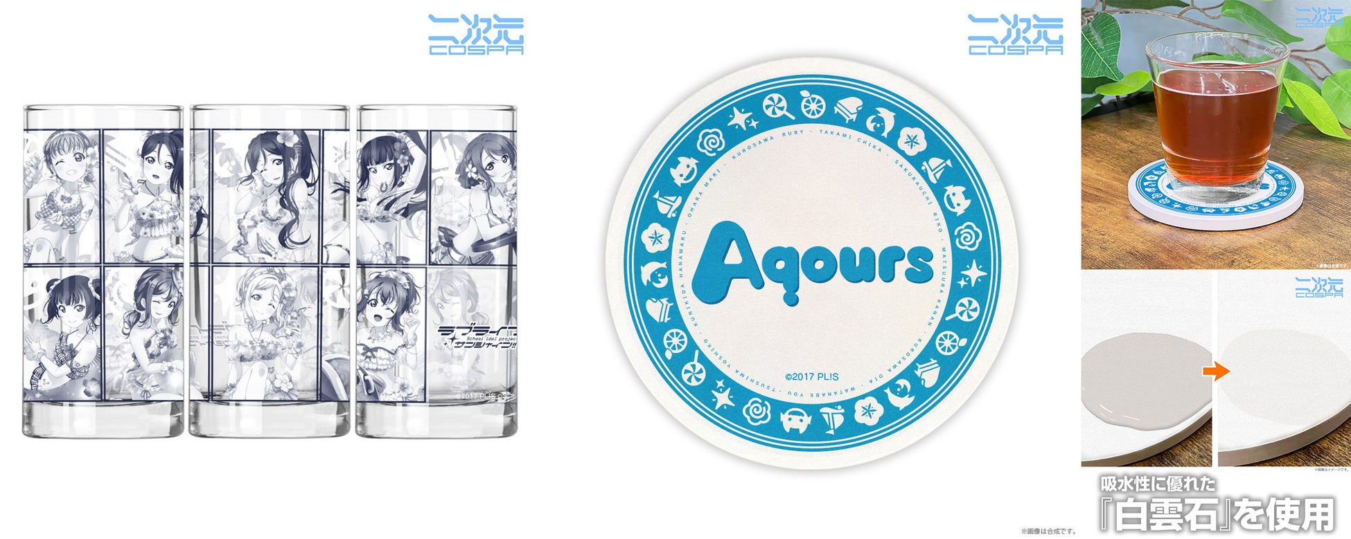 「CYaRon!」「Guilty Kiss」「AZALEA」それぞれを代表する印象的な衣装のメンバーたちの「アクリルスタンド」をはじめ、Aqoursの「グラス」「ストーンコースター」が二次元コスパからラインナップいたします。