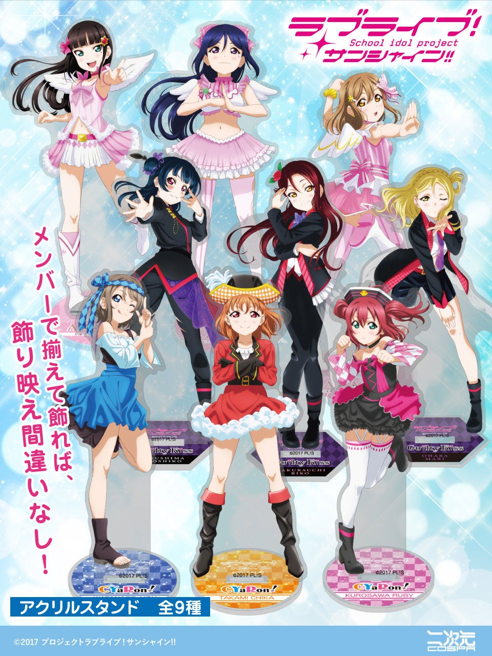 『ラブライブ!サンシャイン!!』CYaRon!、Guilty Kiss、AZALEAそれぞれの「アクリルスタンド」やAqours「グラス」「コースター」が二次元コスパから登場!【株式会社コスパ】