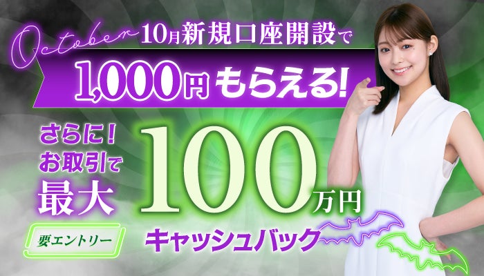 10月に新しく口座開設いただいたお客さまを対象に、2025年11月14日(金)16時00分までにキャンペーンエントリーからお申込みでもれなく1,000円をキャッシュバック、さらに期間中のお取引数量に応じて、最大100万円をキャッシュバックいたします。