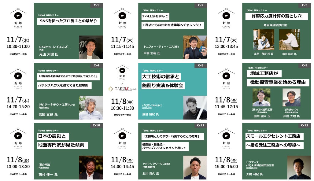 また識者による市場動向や業界の展望などを聴くことができる「特別講演」、ここでしか聴けない有料級の「オープン講座」、専門家と直接話すことができる「相談コーナー」、「工務店向けの交流会」など、様々なニーズを網羅する総合展となっております。