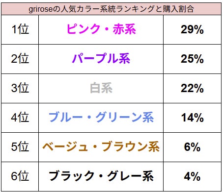 griroseでは、2025年2月12日(水)から8月5日(火)までの購入モデルからカラー系統を集計し、ランキングにまとめました。1位はgriroseでもカラーバリエーションが多い「ピンク・赤系」、2位は僅差で「パープル系」がランクインしました。昨今人気のピンク・パープルが全体の5割以上を占め、定番カラーとして定着していることがわかります。griroseでは、同じ色系統でも、つややかなエナメル調、パールのような光沢感、エレガントな色味や落ち着いたニュアンスカラーなど、質感やトーンの違いを楽しめるラインアップをご用意。大人が見ても心躍る、上品で可愛らしいカラー展開が特徴です。