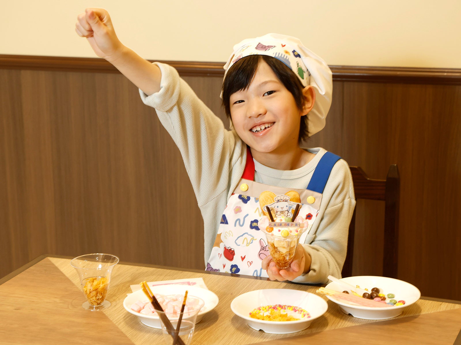 デザートメニュー制作工房でオリジナルのキャラクターパフェを作るワークショップです。最後には「おいしくな~れ♪」の魔法を唱えて完成です。 |