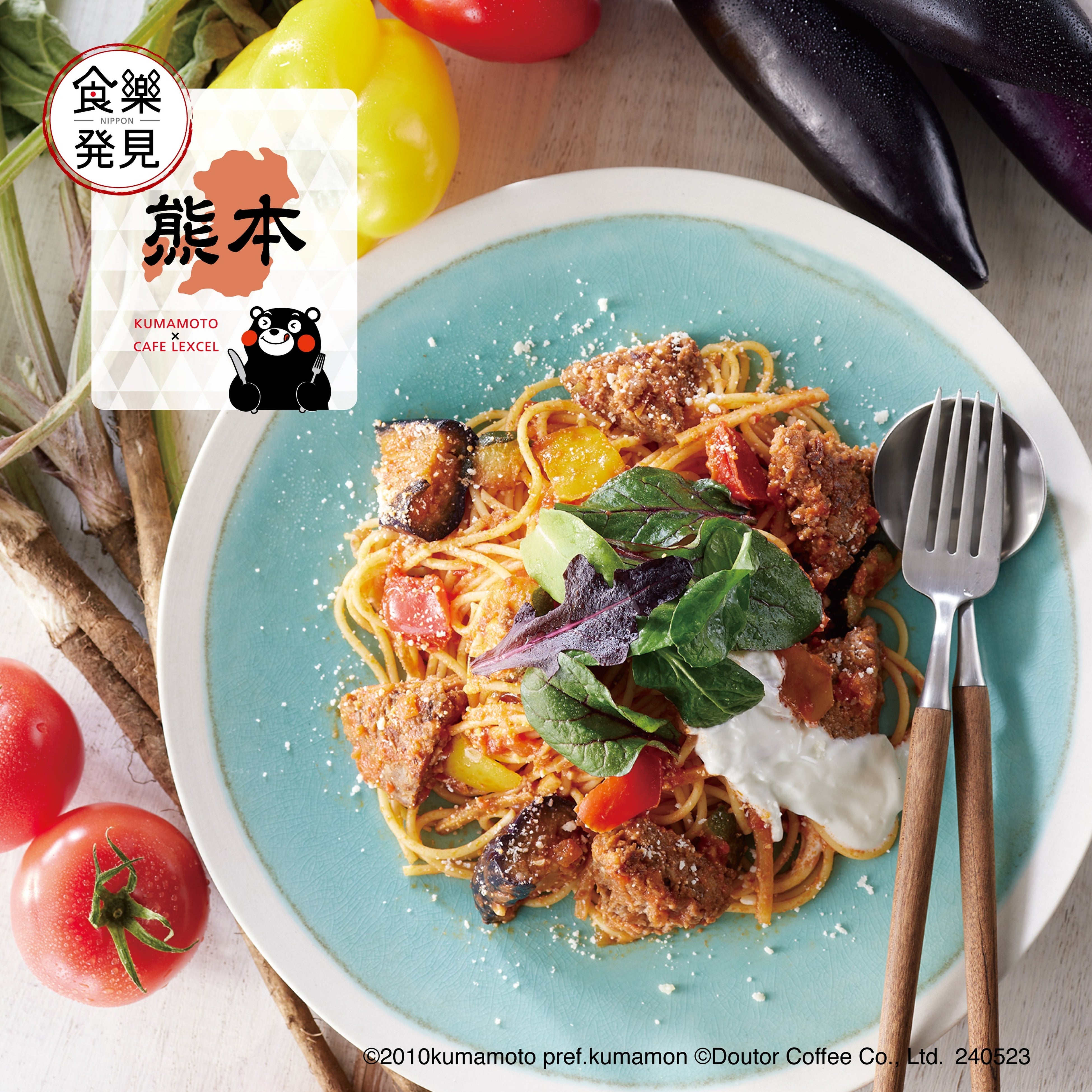 熊本の食文化と彩り夏野菜をボリュームたっぷりで味わえるごちそうパスタです。馬肉※1ハンバーグ※2に水田ごぼう※3と夏野菜をピリ辛トマトのソースでラタトゥイユ風に仕立てました。熊本県の郷土料理「ぶたあえ」より着想し、「麦みそ」を加えてコクを出したトマトみそソースをベースに、ピリ辛なトマトのソースを和え、ナス、赤・黄ピーマン、ズッキーニなどの夏野菜を合わせたオリジナルレシピです。水田ごぼうで食感と和の味わいをプラス。パスタに添えた濃厚なヨーグルトを混ぜながら食べ進めると、ヨーグルトの酸味ですっきりと爽やかな味わいの変化を楽しめます。