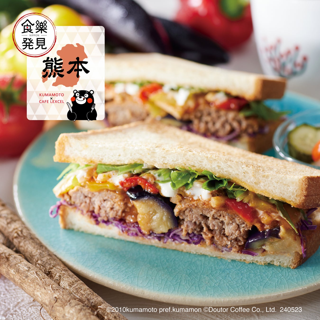 熊本の食文化と彩り夏野菜をボリュームたっぷりで味わえるごちそうサンドです。馬肉※1ハンバーグ※2に、水田ごぼう※3と夏野菜をピリ辛トマトのソースでラタトゥイユ風に仕立てたデリを重ねました。熊本県の郷土料理「ぶたあえ」より着想し、「麦みそヨーグルトソース」と、「麦みそマヨソース」の2つの特製ソースを合わせたオリジナルレシピです。水田ごぼうが食感と和の味わいをプラス。さらに、馬肉ハンバーグのおいしさを一層アップさせる黒煎り七味を仕上げにひと振りした、食欲そそるサンドイッチです。
