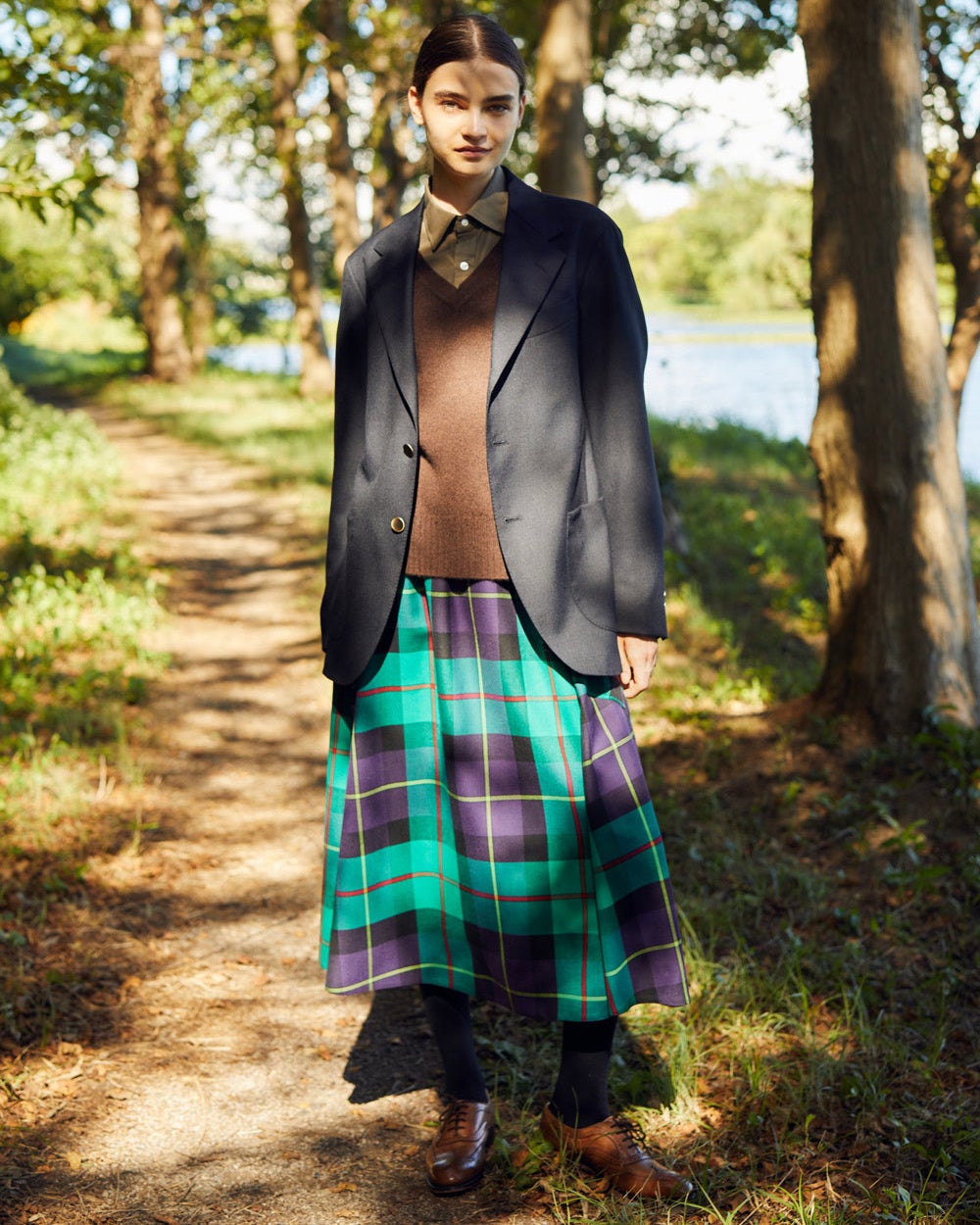 紺ブレザーにチェックスカートを合わせたメンズライクなスタイルにもマッチしてくれます。グリーンやパープルなど鮮やかな配色のスカートは、一枚で主役になる存在感があるので、トップスや足元にはベーシックカラーを合わせるのがおすすめです。