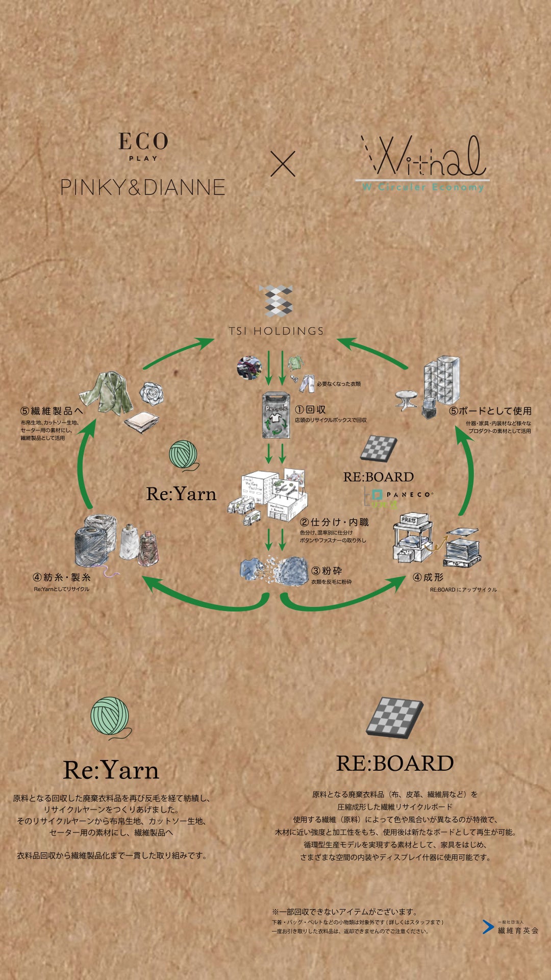 株式会社TSI(東京都港区 代表取締役社長 下地毅)が展開するアパレルブランド「PINKY&DIANNE」は、環境保全の取り組みとして、繊維育英会が行う地球環境問題に取り組む資源環境プロジェクト「Withal(ウィゾール)」と、また新たな資源として活用する循環キャンペーン「ECO PLAY」を4月1日(土)から開始します。