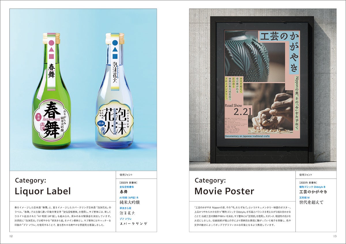 DODO DESIGNによる特集企画では、コミック表紙、Webサイト、お酒ラベル、イベントグッズなど、2023年新書体を使った全6つのグラフィック作例が登場。個性的な書体によって生まれる多彩なデザインが、創作活動のヒントにつながります。