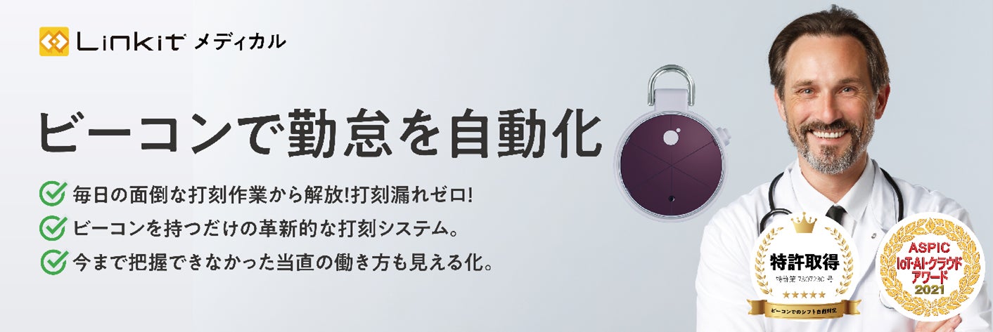 「Linkit 勤怠」および「Linkit エリア探索」は、医療機関における医師の勤怠管理を効率化します。専用のBLE(Bluetooth Low Energy)モジュール搭載の携帯型ビーコンとゲートウェイ(受信機)を用いて医師やスタッフの所在データを取得し、取得したデータから出退勤時刻を抽出してクラウド経由で勤怠管理システムと連携させることで、客観的な勤怠実績の把握を自動的に実現するサービスです。管理が難しいとされるシフト勤務への対応や、宿直・当直時間の管理の自動化も可能です。