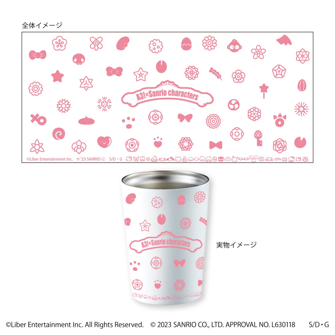 ステンレスタンブラーは飲み物の保温・保冷に便利なアイテムで、劇団員とサンリオキャラクターズのモチーフイラストが散りばめられたおしゃれなデザインで登場しました。