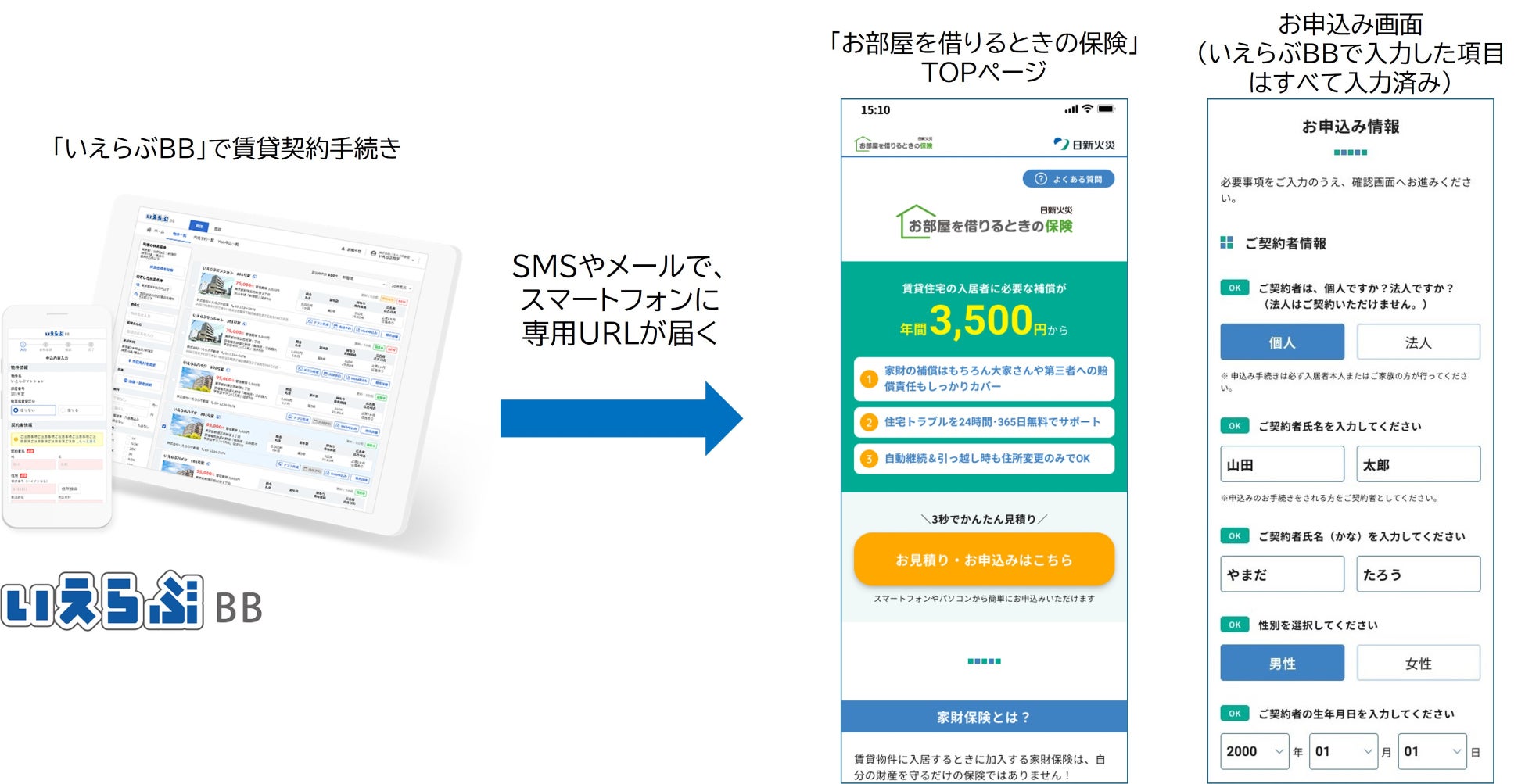 株式会社いえらぶGROUP(本社:東京都新宿区、代表取締役:岩名 泰介、以下「いえらぶGROUP」)、日新火災海上保険株式会社(本社:東京都千代田区、取締役社長:織山 晋、以下「日新火災」)、株式会社Finatext(本社:東京都千代田区、代表取締役CEO:木下 あかね、以下「Finatext」)は、不動産業者間流通プラットフォーム上で家財保険に申込み・加入できる仕組みを共同開発しました。不動産のリーシング業務をワンストップでオンライン化する業者間流通プラットフォーム「いえらぶBB」内で、インターネット完結型の賃貸入居者向け家財保険「お部屋を借りるときの保険」の提供を開始します。