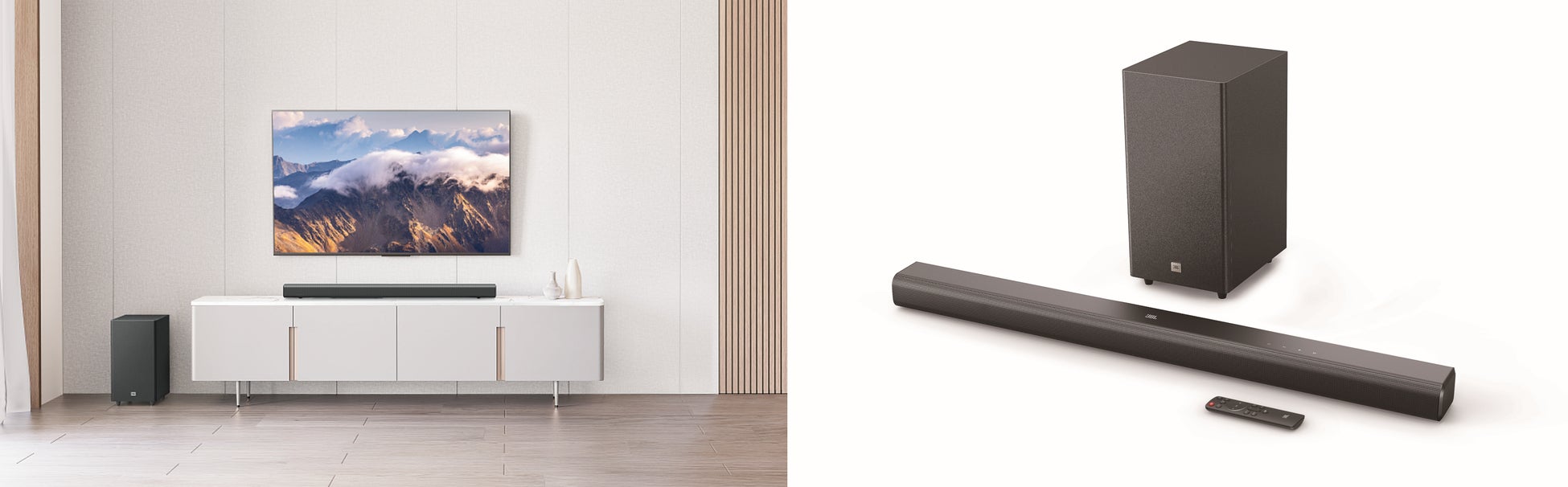 そして今回新たに、サブウーファーをセットにした3.1chスピーカー構成の「JBL CINEMA SB580」をラインナップ。サウンドバー、サブウーファーともにスリムな設計でありながら440Wのパワフルな出力を誇り、「Dolby Atmos®」による最新のサラウンド技術を採用、映画の醍醐味である「包まれるサラウンド」と「圧巻の重低音」に特化し、エントリープライスでありながらご自宅で本格的な最新の没入型シアター体験を実現します。
