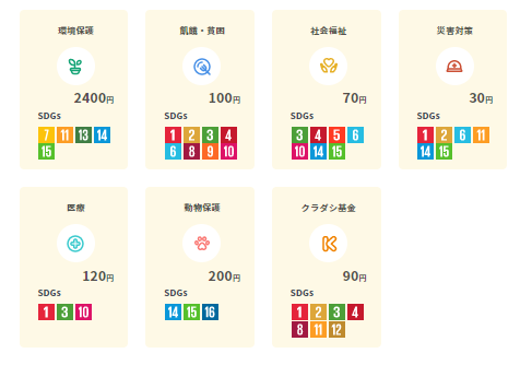 Kuradashiは売上の一部を医療支援や環境保護支援などの活動を行う社会貢献団体に寄付しており、常設店の売上の一部も寄付いたします。