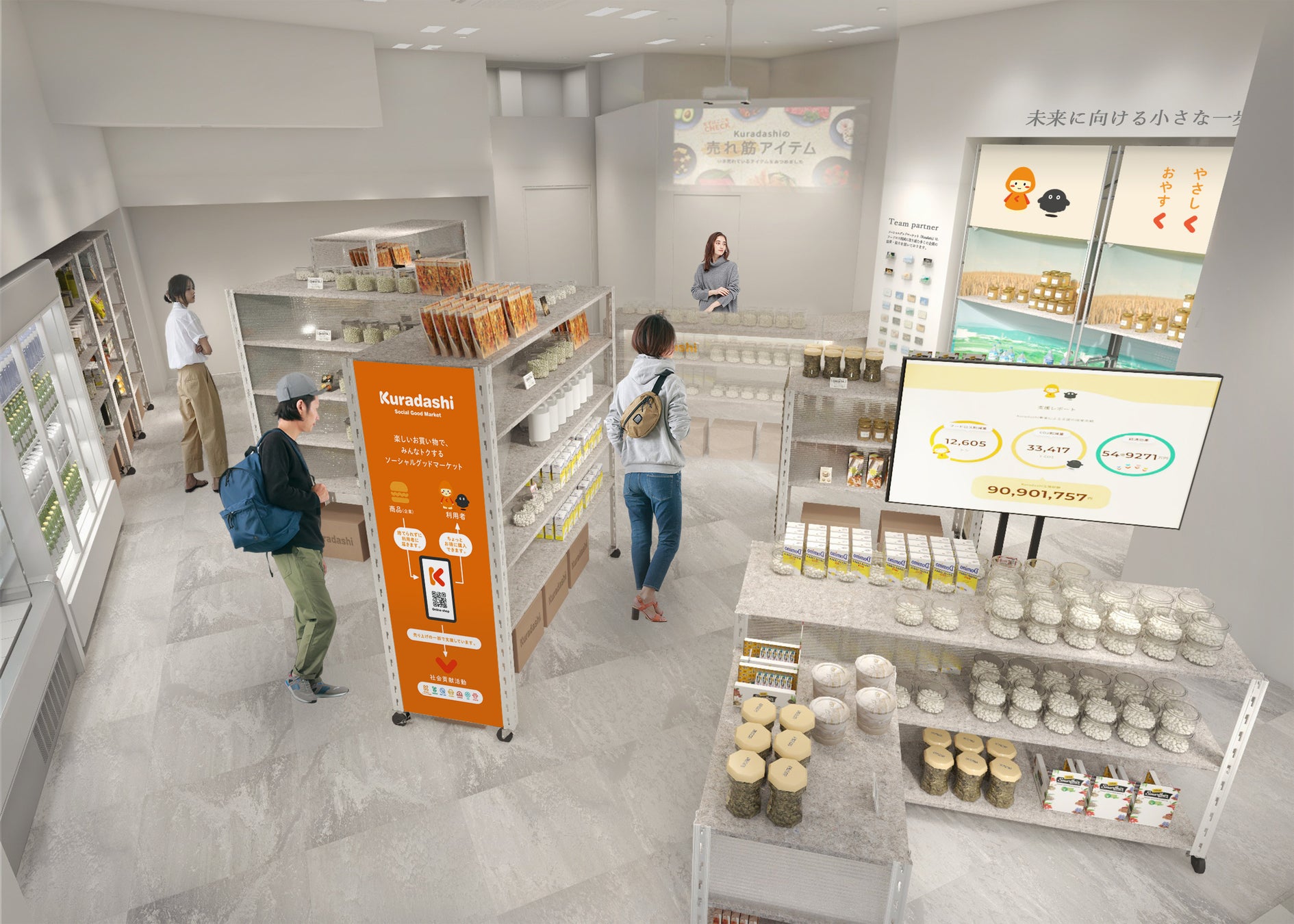 Kuradashi常設店舗では、「社会にいいこと、街にいいこと」をコンセプトに掲げ、「見る・知る・関わる」の3つのテーマに合わせた仕掛けを用意し、おトクにお買い物を楽しみながら、フードロス削減をはじめとした、社会貢献活動を気軽に日常の生活に取り入れるような店舗づくりを目指しています。