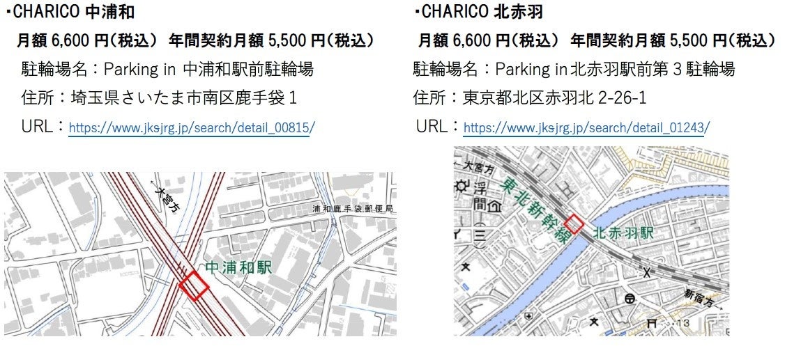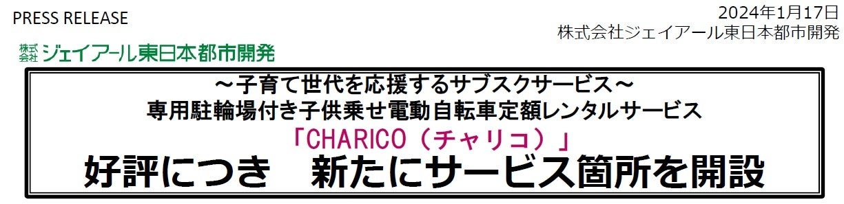株式会社ジェイアール東日本都市開発は、専用駐輪場付き子供乗せ電動自転車定額レンタルサービス「CHARICO(チャリコ)」がご好評をいただき、千葉県で初開設の本八幡駅を含む北赤羽駅、南与野駅の3箇所で2024年1月から新たにサービスを開始しました。