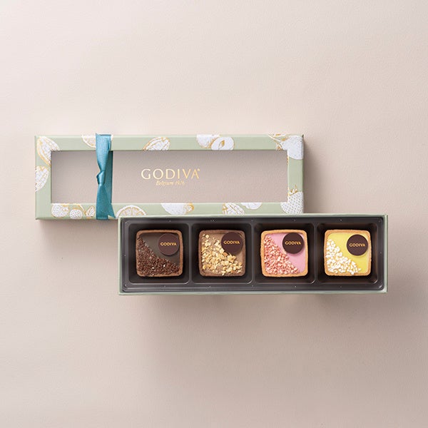 濃厚なチョコレートやナッツの香ばしさが味わい深い「タルトショコラ ダブルチョコレート」、「タルトショコラ ヘーゼルナッツ」と、チョコレートと爽やかなフルーツが甘美な「タルトショコラ ストロベリー&チョコレート」、「タルトショコラ レモン&チョコレート」の、全4種類のフレーバーが登場します。4種類のフレーバーをモチーフとしたシックなイラストをあしらい、見た目にも華やかなカラフルなピースがのぞく、クリアなパッケージは季節を問わずさまざまなギフトシーンでご利用いただけます。スイーツのタルトをチョコレートで表現した「ゴディバ タルトショコラ」をご堪能ください。