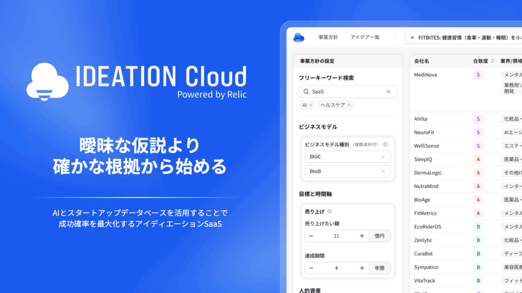 「IDEATION Cloud」は世界中の資金調達済みスタートアップの成功事例を集約したファクトデータベースとRelicがこれまでに蓄積してきた知見やノウハウを掛け合わせて構築した独自データベースを元に、事業アイデアを考えることが可能です。また、生成AIが壁打ち相手となり、事業アイデアのブラッシュアップを多角的に支援します。