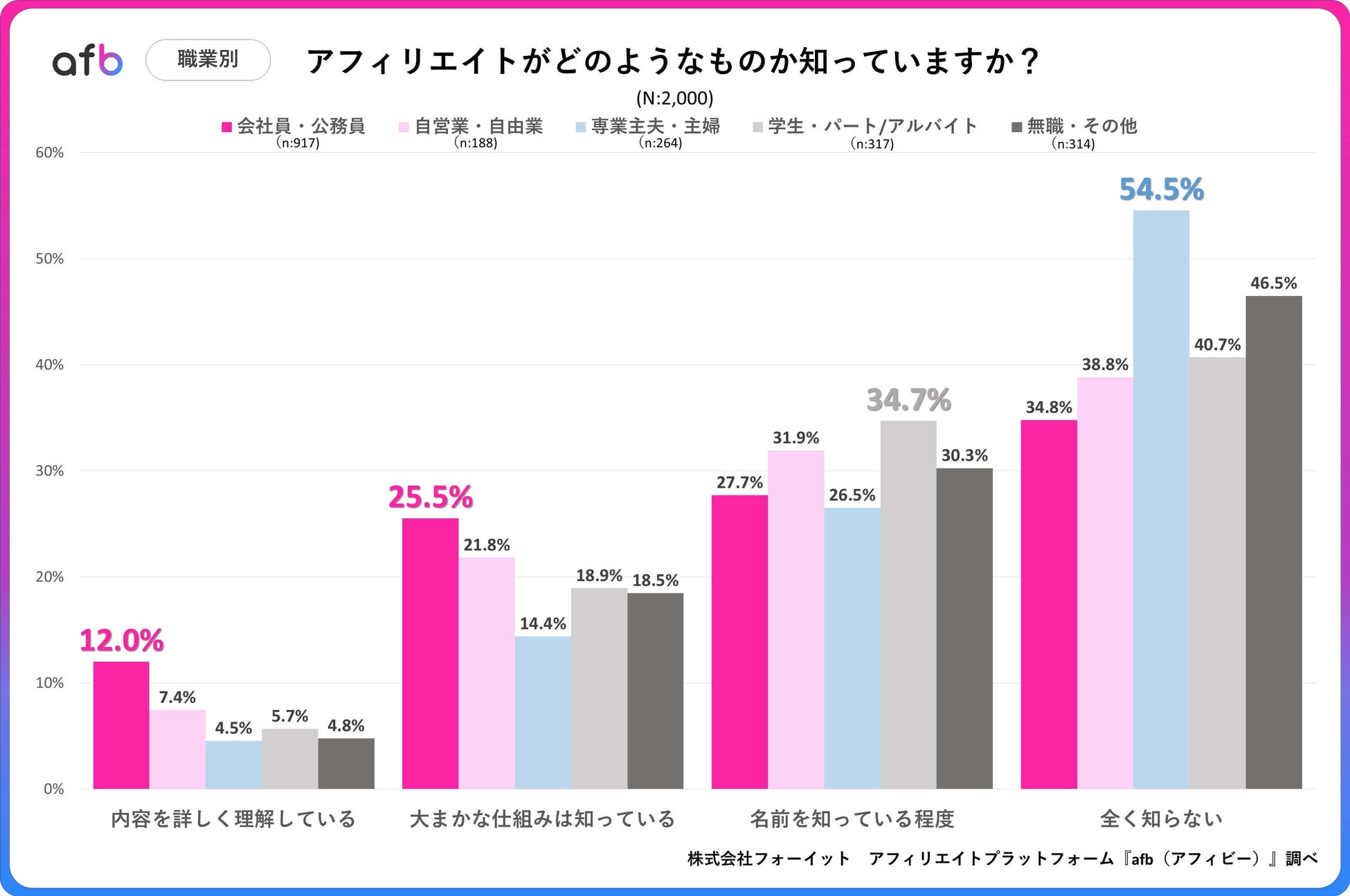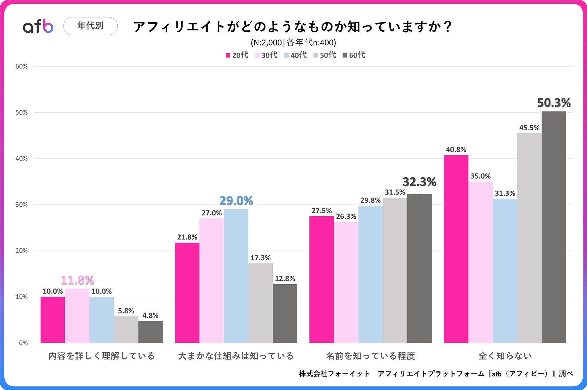 アフィリエイトプラットフォーム「afb(アフィビー)」< https://www.afi-b.com/ >の開発運用をおこなう株式会社フォーイットは、全国の20代~60代までの男女2,000人を対象にアフィリエイトに関するアンケートを実施し、年代別等の特徴についてまとめました。