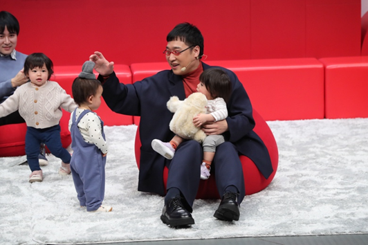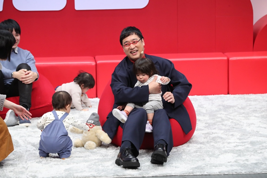 その後のトークセッションでは、まるでキッズスペースのような空間に移動し、開発に協力したママパパとその赤ちゃん、合計6組も登壇。山里さんには、インタビュアーとしてママパパの本音や悩みを聞いていただきました。ステージには山里さんそっくりのメガネをかけたイルヨのぬいぐるみも用意され、自分そっくりのイルヨに「赤いメガネをかけているということは私の分身ということですか?かわいいですね。僕のプリティさが表現されていますね。より親近感が湧きます!」と、山里さんも思わず笑顔に。和やかな雰囲気でトークセッションが始まりました。すると登壇されたひとりの赤ちゃんが山里さんの近くへ。山里さんそっくりのイルヨを抱きしめて安心しきっている様子に「イルヨが赤ちゃんの心を掴んでますね」とコメント。