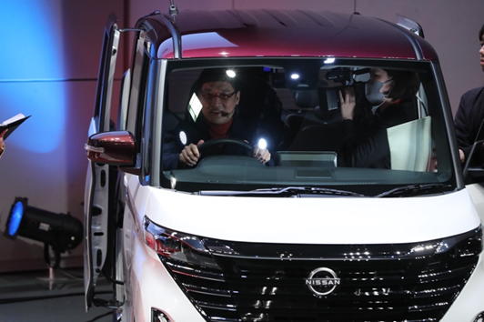その後、山里さんにはステージ上に用意した日産「ルークス」に乗り込んでいただき、実際に車内に取り付けたイルヨが機能する様子を体験いただきました。かける言葉によって動きが変わるイルヨに、山里さんは「ここにいるよー!」「こっちだよ!」と声をかけ、実際に動くイルヨに「普通に運転していて、体勢を変えなくても作動するんですね。赤ちゃんからしたら自分に手を振ってくれていると感じてうれしいだろうな。」とコメント。