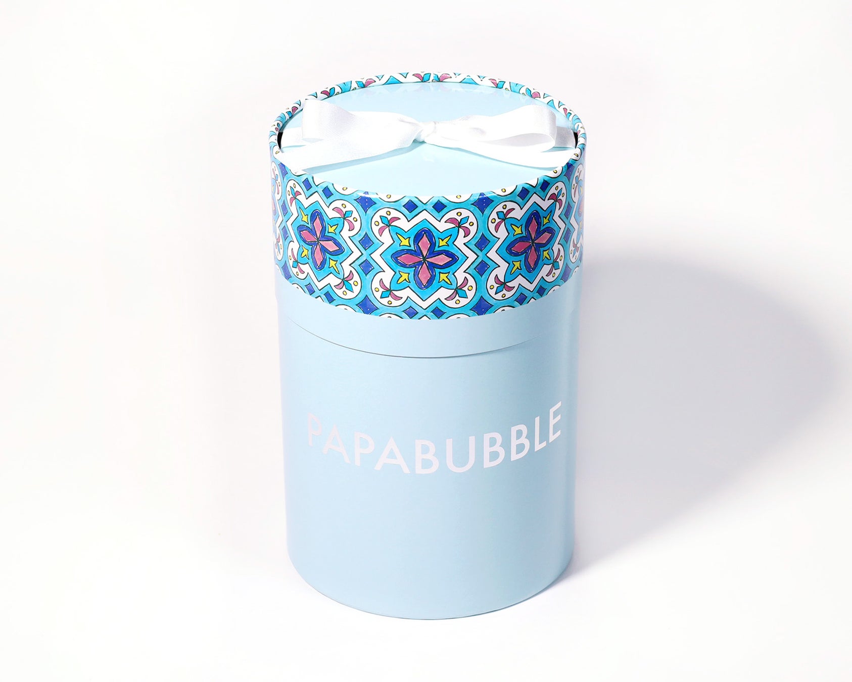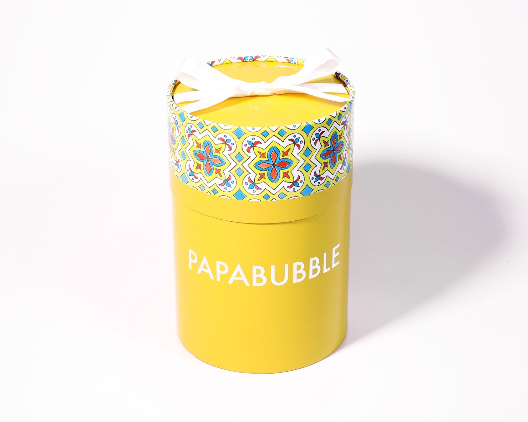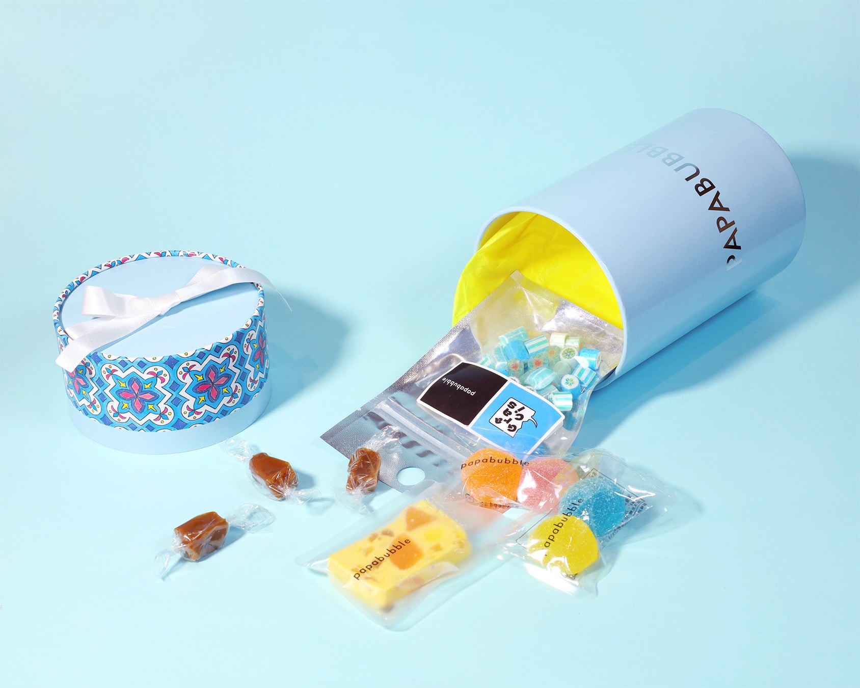 用途に合わせて選べる、円形ボックスに入った2種類のギフト。〈水色〉は限定キャンディBAGやバブレッツ、チョコレート、キャラメルなど、パパブブレの人気商品が贅沢に入っており、大切な方への贈り物におすすめなギフトです。〈黄色〉は限定キャンディを含む小分けタイプが15袋入っており、学校や職場など大人数へのプチギフトにぴったり。ぜひそれぞれの用途に合わせてお選びください。