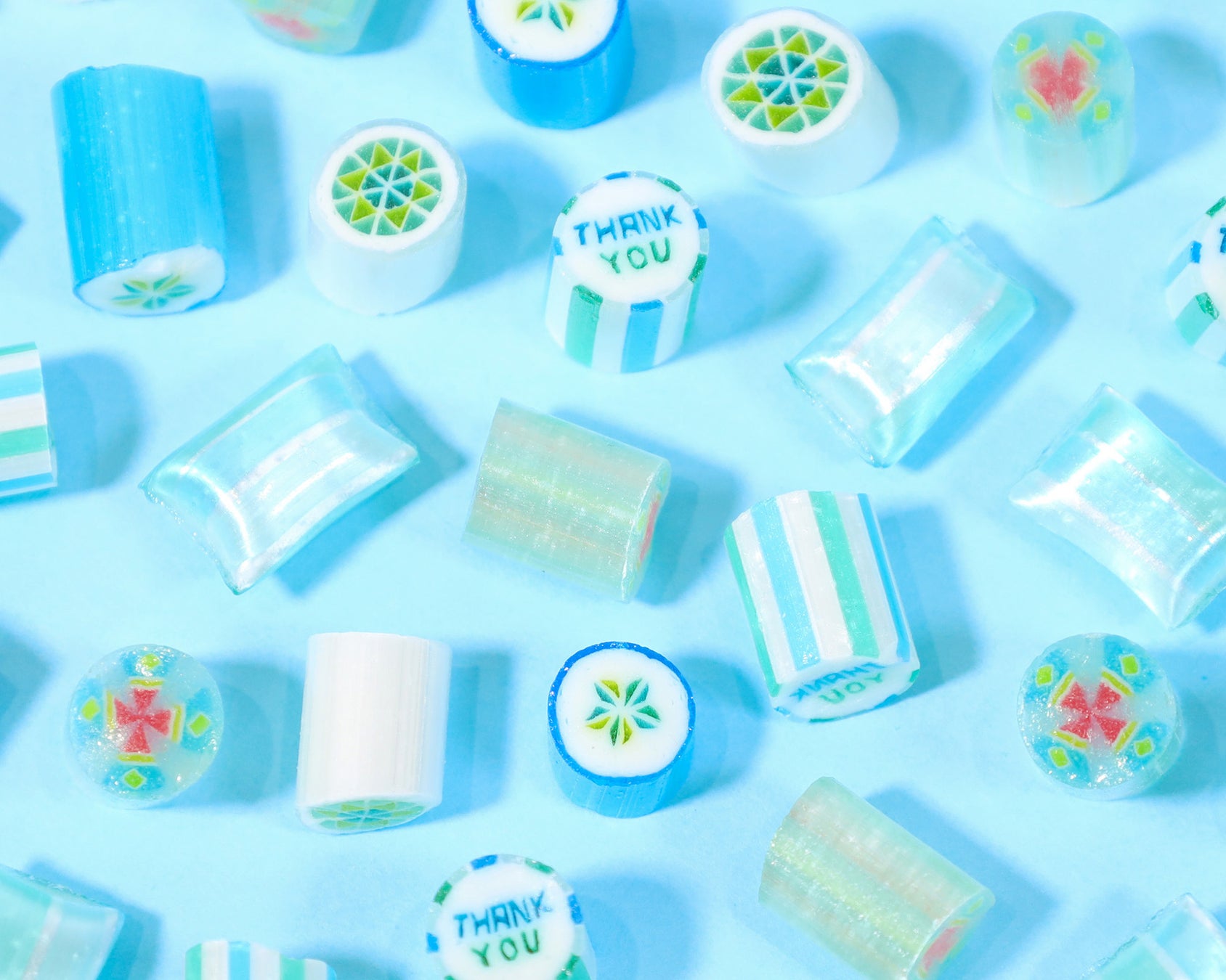 「ピーチヨーグルト」「フルーツティー」など、女性人気の高いフレーバーで仕上げた、ステンドグラス風デザインのキャンディです。「THANK YOU」の文字も入っているので、普段は言えない感謝の言葉をキャンディに託して贈ることもできます。バレンタインのお返しギフトにもおすすめです。