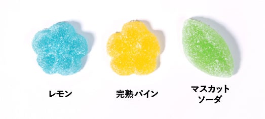 (青:蜜りんご/黄:ゴールデンキウイ/ピンク:贅沢いちご)