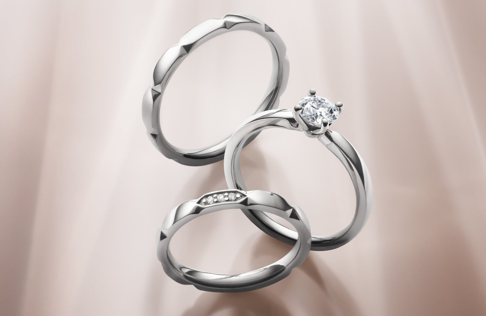 6角形のフォルムは長寿や永遠を象徴し、繊細な面の輝きがふたりを特別な輝きで包みます。
