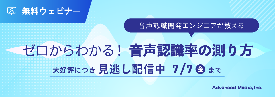 株式会社アドバンスト・メディア(本社:東京都豊島区、代表取締役会長兼社長:鈴木清幸 以下、アドバンスト・メディア)は、6月12日(月)~7月7日(金)の間、5月25日(木)に開催しご好評いただいたオンラインセミナー「音声認識開発エンジニアが教える~ゼロからわかる!音声認識率の測り方~」の見逃し配信を実施いたします。