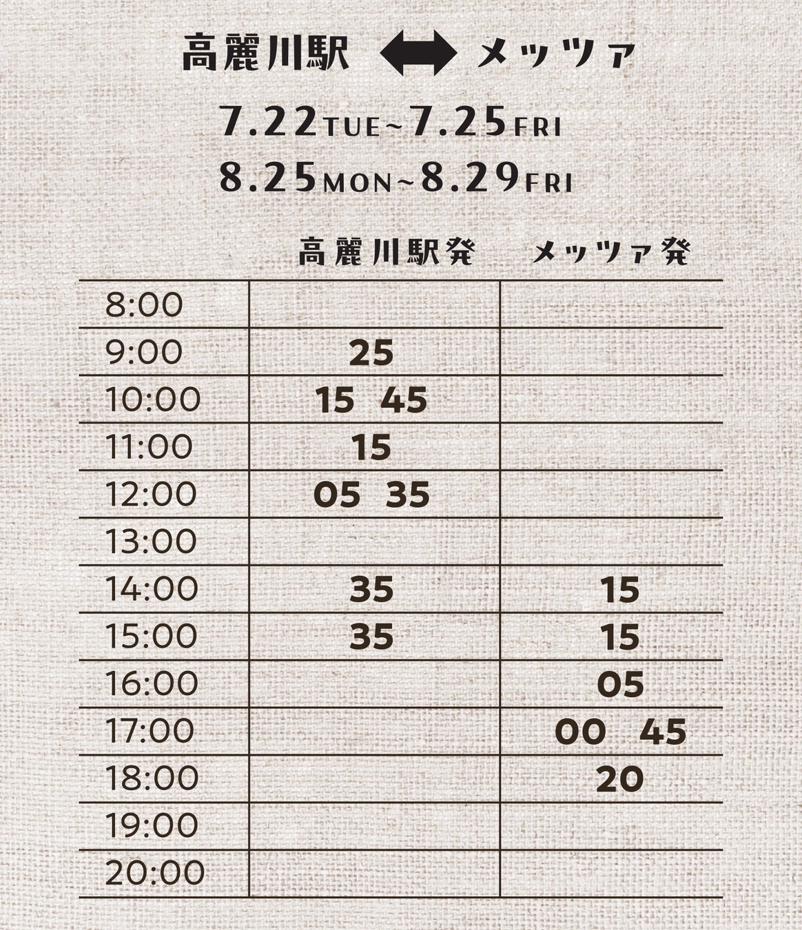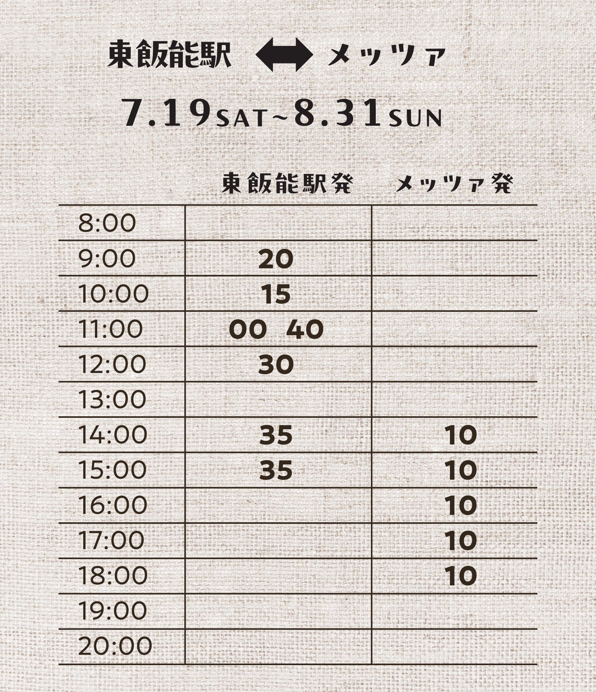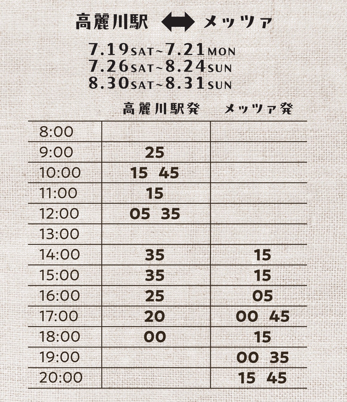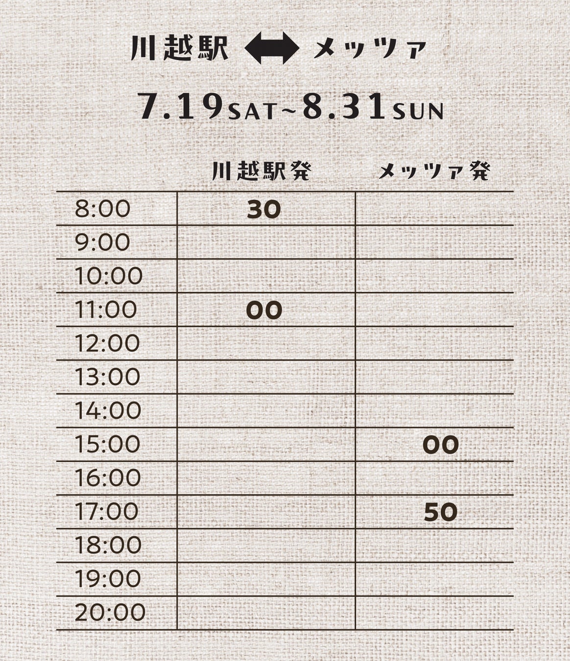 ※発着時刻など都合により今後変更となる場合もございます。その場合、詳細についてはホームページで告知いたします。(https://metsa-hanno.com/event/38767/)