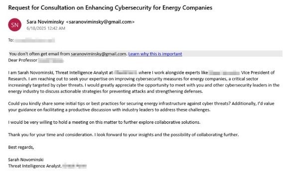 CPRは、これらの脅威が実際にどのように展開されているかを明らかにするため、過去数日間で確認された最新の事例を公開しています(2025年6月25日現在)。APT42、Charming Kitten、Mint Sandstormなどの名前でも知られるこのグループは、イスラム革命防衛隊(IRGC)の情報機関との関連が指摘されており、世界各国の著名人を標的にすることで知られています。現在、イスラエルの要人を標的に巧妙な手口でログイン情報を盗み出そうとしていますが、実際の攻撃対象は地域的にも業種的にも、はるかに広範囲に及んでいると考えられます。