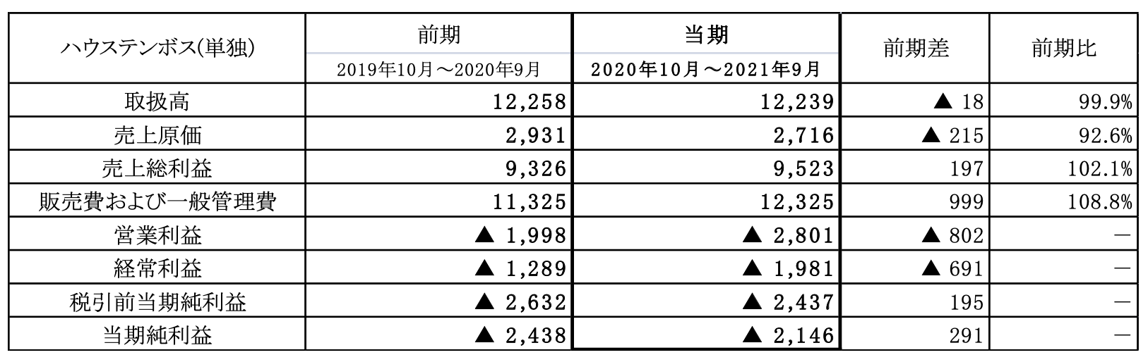 【 2021年9月期のハウステンボス株式会社(単独)業績 】 (2020年10月1日 ― 2021年9月30日)