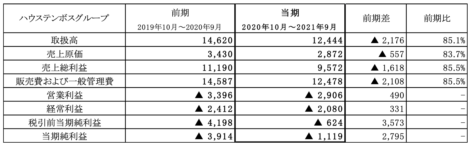 ハウステンボス株式会社(本社:長崎県佐世保市)とグループ会社の 2021年9月期の連結業績は以下の通りとなりました。
