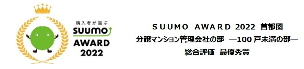 2022年首都圏版 顧客満足度ランキング 「SUUMO AWARD」 総合評価 「最優秀賞」 を2連続で受賞(100戸未満の部)