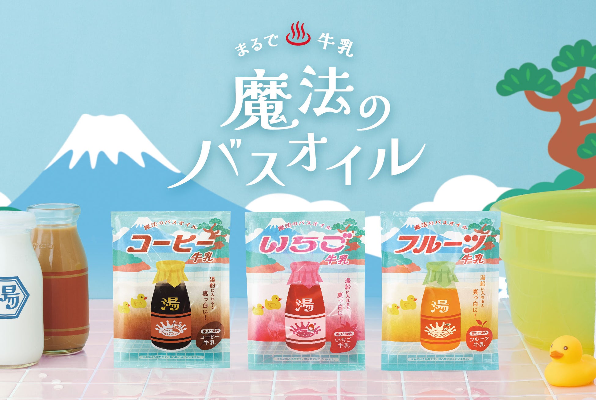 昨年発売した“まるで調味料なバスオイル”「魔法のバスオイル 浸かる醤湯」「魔法のバスオイル 浸かる辣湯」に続き、銭湯で定番の飲み物をモチーフにした『魔法のバスオイル コーヒー牛乳/いちご牛乳/フルーツ牛乳』の発売が決定。
