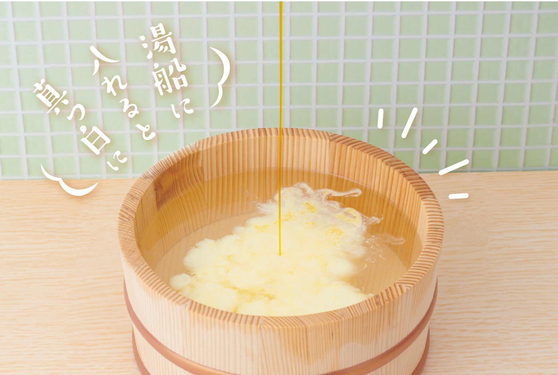 『魔法のバスオイル』をお湯に垂らすと、たちまち乳白色の湯色に早変わり。