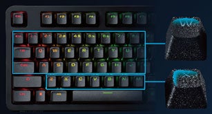 一般的なオフィス向けのシリンドリカルステップスカルプチャ構造を採用せず、高速で指を縦横に往復させるゲーミング特有の動きを阻害しないようにASD列のキートップの四辺はフチを浅く設計。同様に、Q~Y列のキートップ上辺、Z~Mのキートップ上辺と左辺はフチを深くして指を引っかかりやすくすることで、操作ミスを防ぎゲーミングに最適なキー配列を実現しました。キーの印字は色の異なるプラスチックで文字を成型するダブルインジェクション方式を採用。