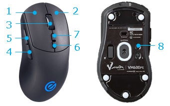 扱うアイテムが多いバトルロイヤル系タイトルでのボタン不足などを解消する8ボタン(上面7+底面1)を搭載。また、マウスの軽さはプレイヤーに重視されるポイントではあるものの、表面の肉抜きをするとゴミの混入や手触りの悪化を引き起こすデメリットがあるため、露出しない内側部分を肉抜きすることで、機能性と重量のバランスを取った約75gという軽さを実現。