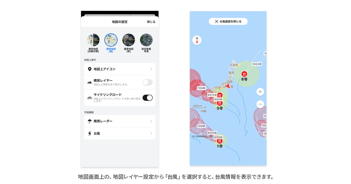 Android OS向けで好評の「台風表示機能」を、iOS向けにも対応しました。地図上に台風の予報円や情報を表示でき、地点検索やルート検索結果とも重ねて確認できるため、台風の通過エリアや時間を避けるなど、安全なサイクリング計画をサポートします。