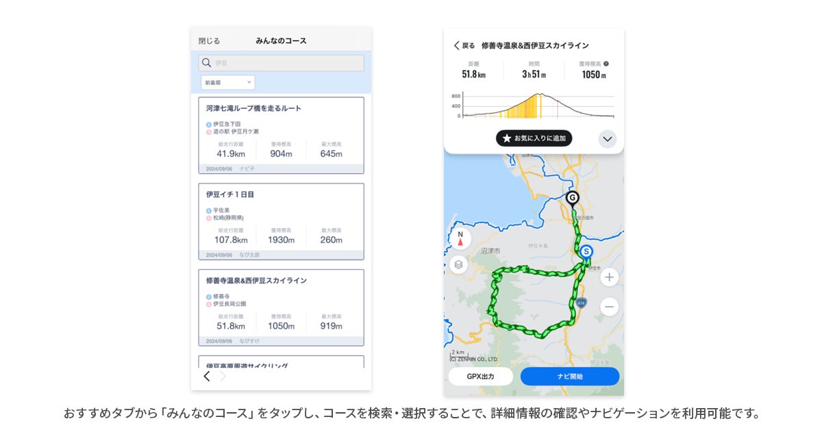 リニューアルに伴い、新機能「みんなのコース」を追加しました。これにより、Web上で公開されている「Myサイクリングコース」をアプリ内で確認、そのままナビゲーションを利用できます。他のユーザーが作成したコースを参考にすることで、サイクリング計画がより充実し、自転車に乗るモチベーションの向上につながります。