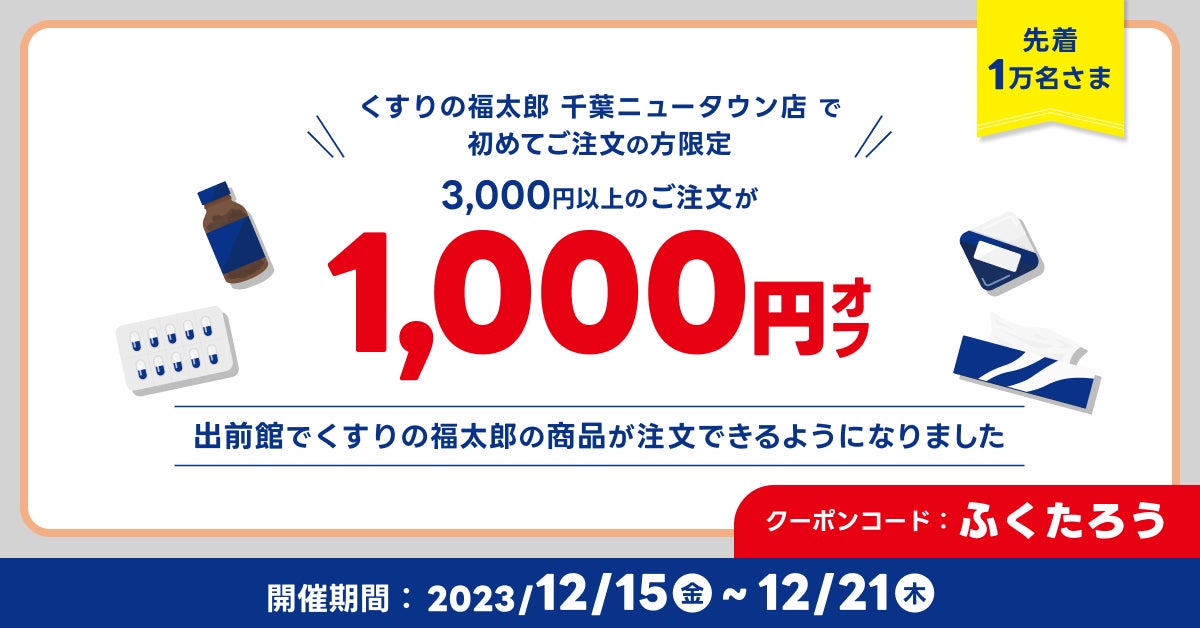 『出前館』での初出店を記念し、「くすりの福太郎」で3,000円以上のご注文の際にご利用いただける1,000円オフクーポンを配布いたします。