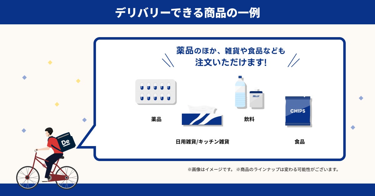 このたび『出前館』でサービスを開始するのは「くすりの福太郎」千葉ニュータウン店で、店舗で扱う日用品や飲料、医薬品など約3,600品目の即時配達が可能になります。『出前館』と「くすりの福太郎」は、サービスを通じて多様化するライフスタイルやニーズにお応えすることで、今後も地域のみなさまの暮らしをサポートしてまいります。