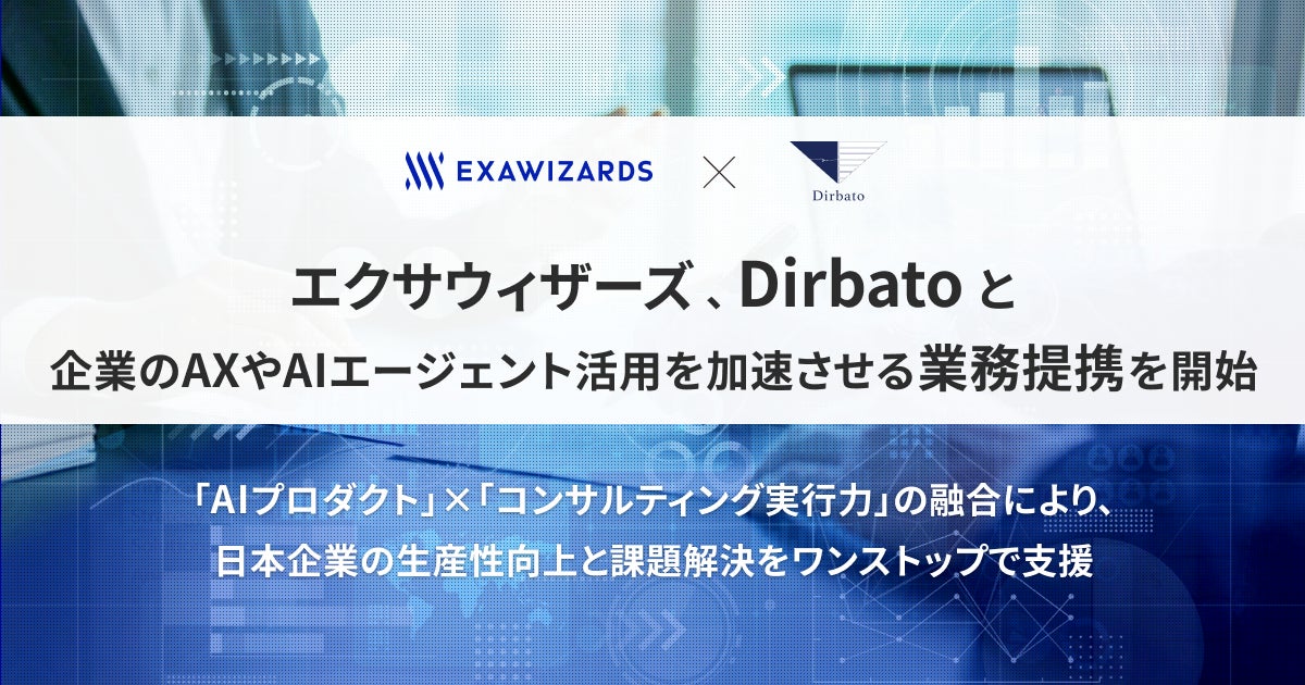 株式会社エクサウィザーズ(東京都港区、代表取締役社長CEO:春田 真、以下エクサウィザーズ)は、テクノロジーとビジネスの融合で企業の変革を支援するITコンサルティングファームの株式会社Dirbato(東京都港区、代表取締役社長:金山 泰英、以下Dirbato)と、業務提携契約を締結しました。エクサウィザーズが保有するAI/AIエージェント開発技術・AIプロダクトと、Dirbatoがこれまで培ってきた生成AIコンサルティング・開発の実績とを融合し、企業におけるAX(AIトランスフォーメーション)やAIエージェントの実装・活用を支援してまいります。